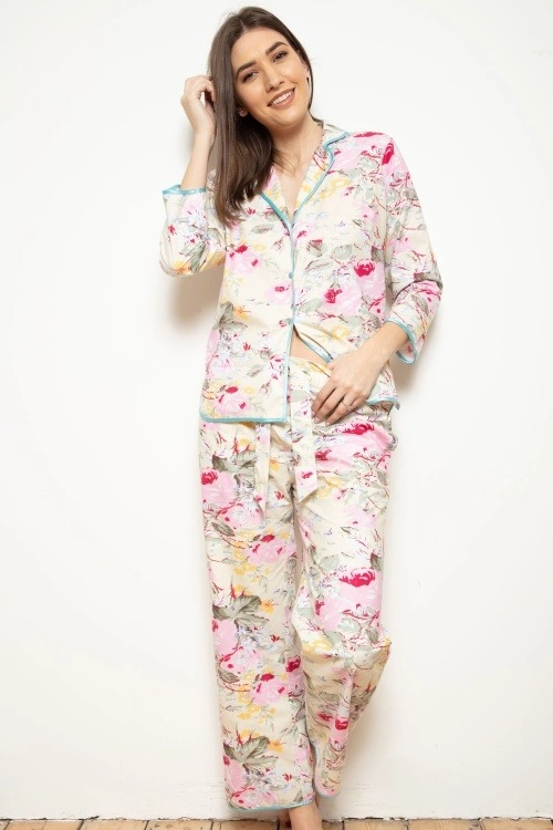 These pretty Floral Pyjamas are an easy addition to our collection of 100% Cotton sleepwear. Featuring a bold collage of flora the PJ top has a revere collar, 3/4 length sleeves, 4 covered buttons and contrast satin trims. The Full length, wide leg pants have a fully gently elasticated waist with an additional wide tie. Make a stylish statement in these attractive PJ - Nightwear to be seen in.