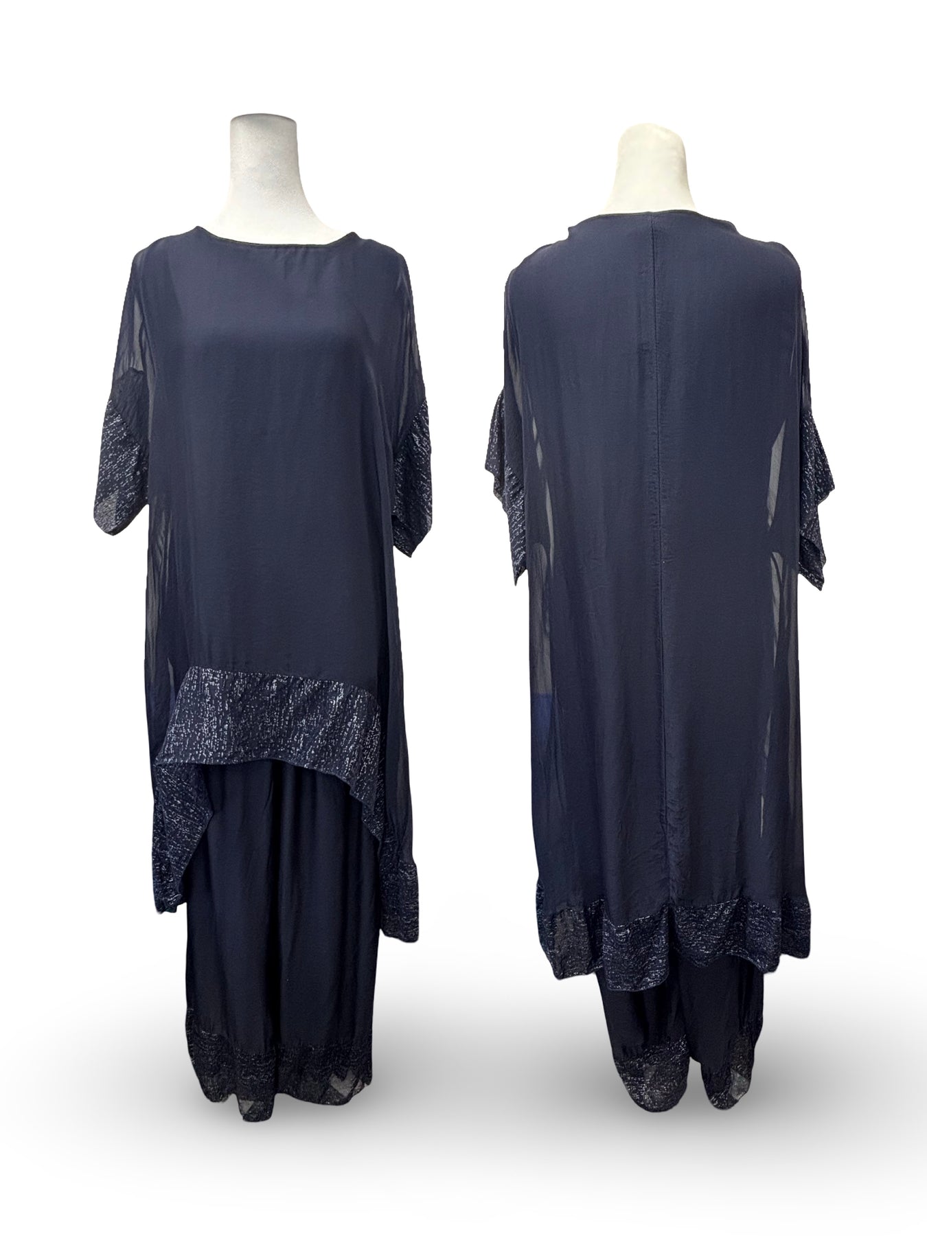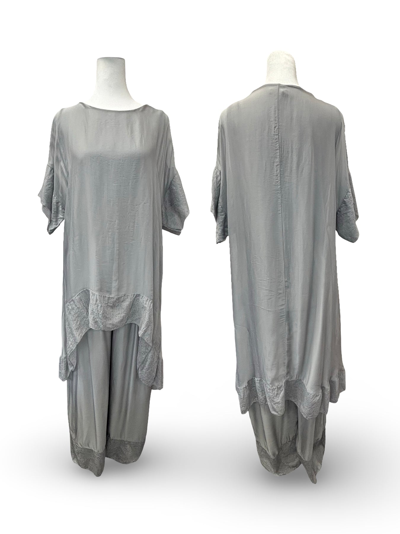 Effortless sophistication meets comfort in this beautifully designed washable silk pant set. The flowy tunic top features an asymmetrical hemline and shimmer-trim detailing on the sleeves and hem for a touch of refined sparkle. Paired with matching wide-leg silk pants, this ensemble offers a graceful silhouette that moves beautifully with every step.