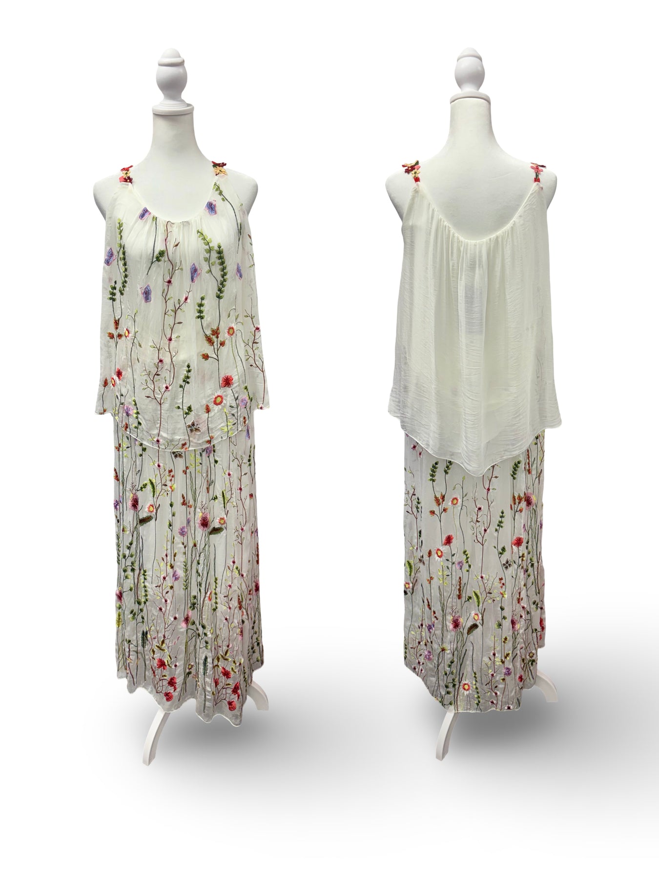 Delicate floral embroidery cascades across the front, adding soft color and intricate detail, while the back remains smooth and minimal for a balanced, elegant look. The feminine scoop neckline and subtle gathered straps create graceful movement and an elevated finish.