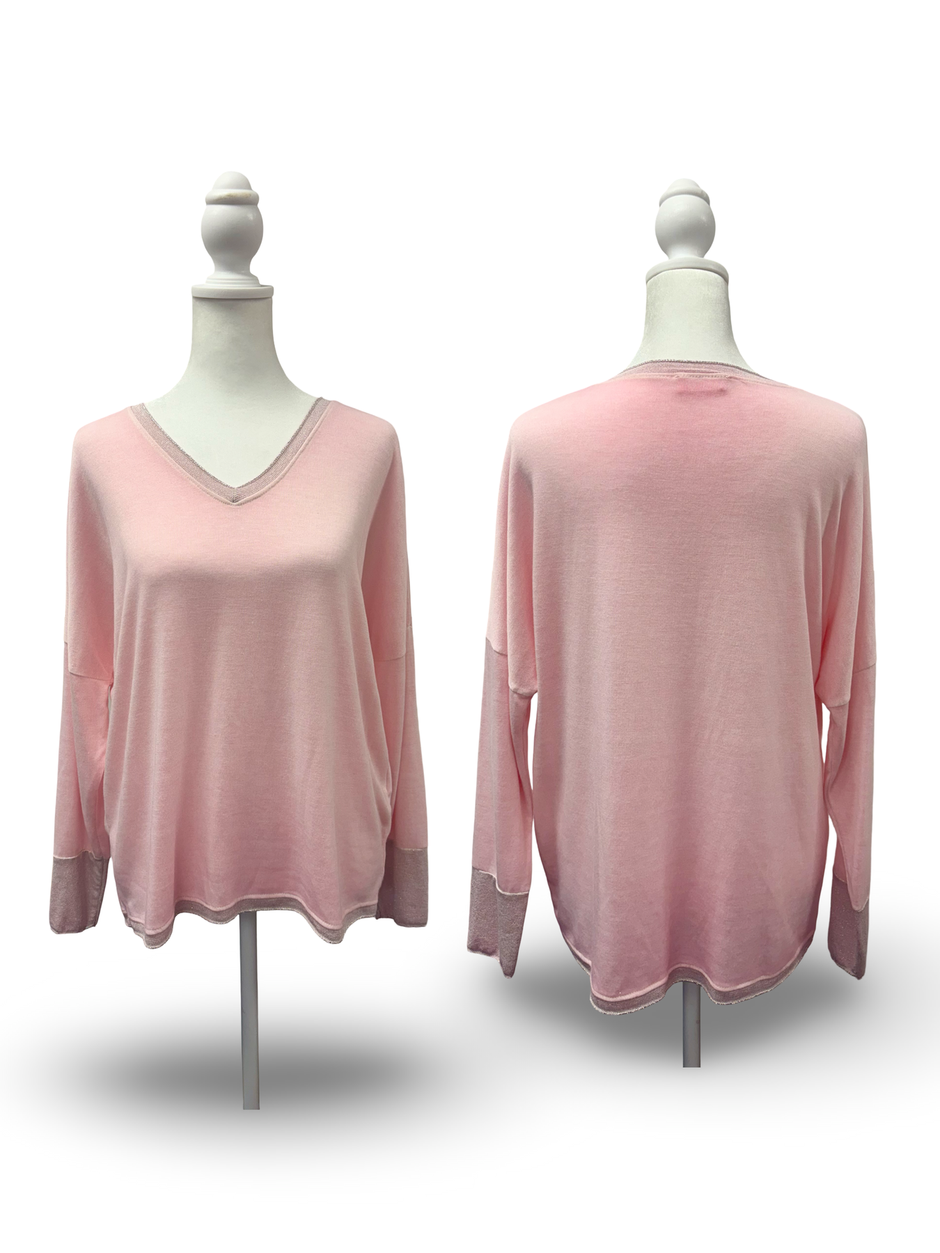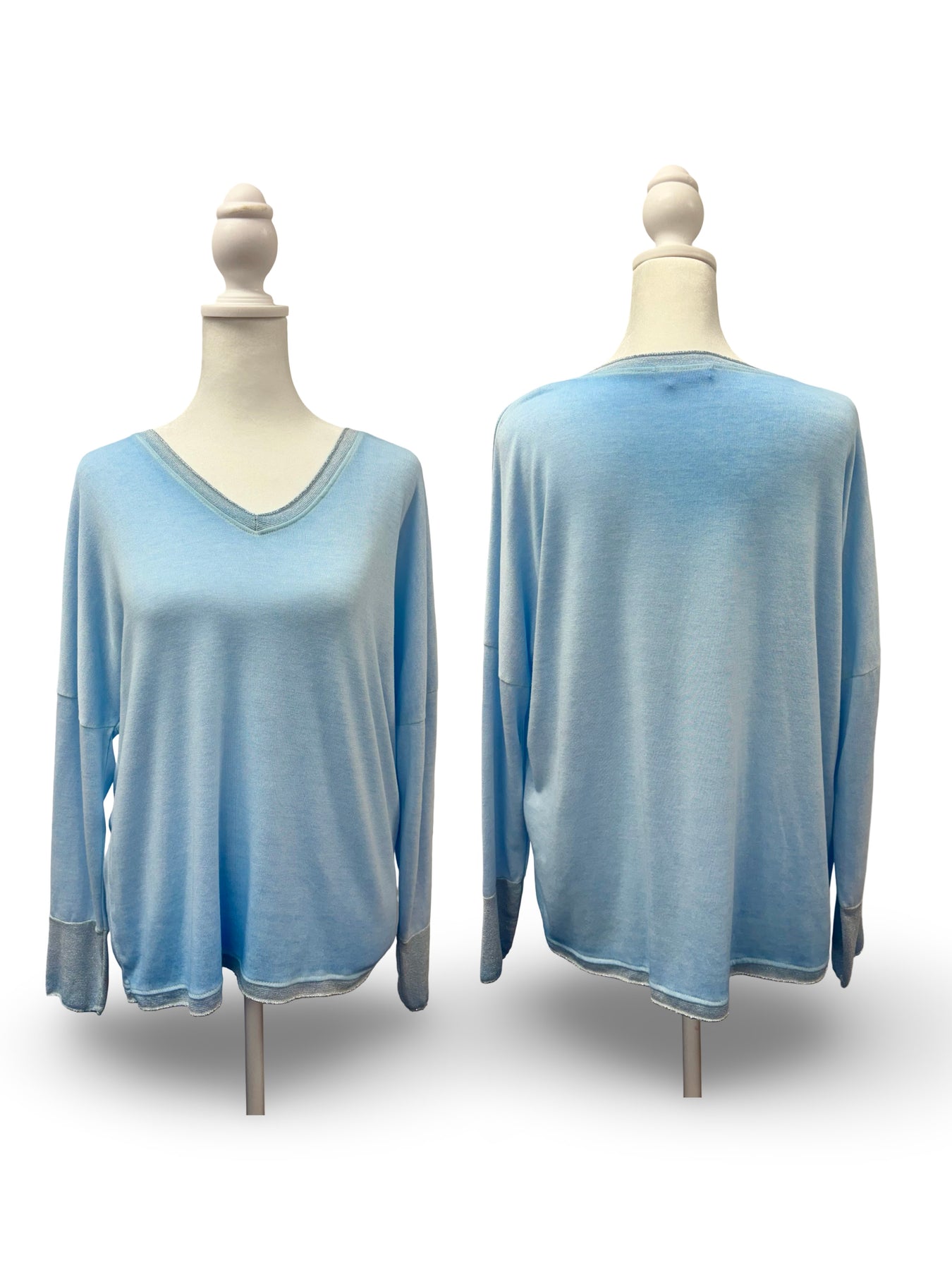 Effortlessly chic and endlessly wearable, this Italian-made V-neck knit top is crafted from a soft, lightweight viscose blend that drapes beautifully on the body. Designed with a relaxed silhouette, it features a flattering V-neckline, long sleeves, and subtle contrast trim at the neckline, cuffs, and hem for a refined finish.