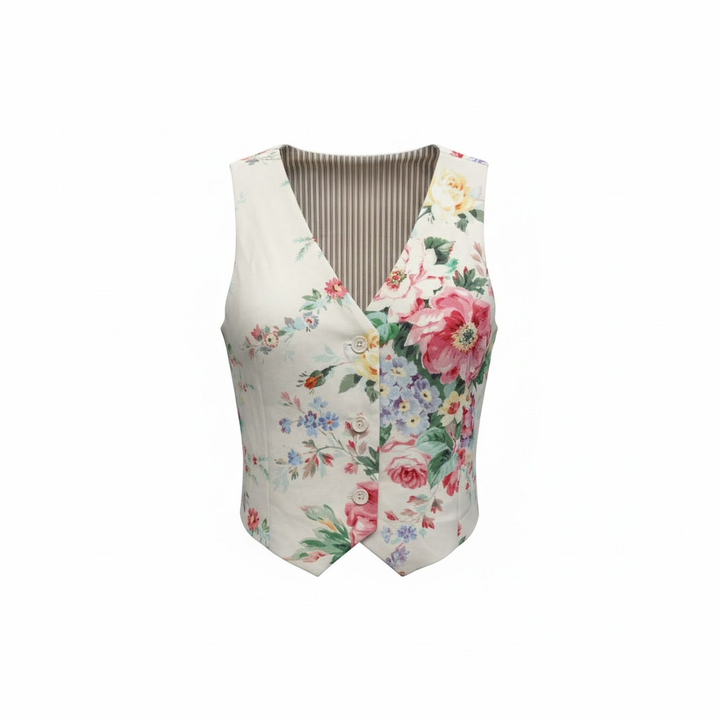 The sleeveless vest-style top features a refined V-neckline and button-front detail, giving it a chic, tailored silhouette. The matching midi skirt showcases a soft floral print throughout and includes a coordinating belt to define the waist and elevate the look.